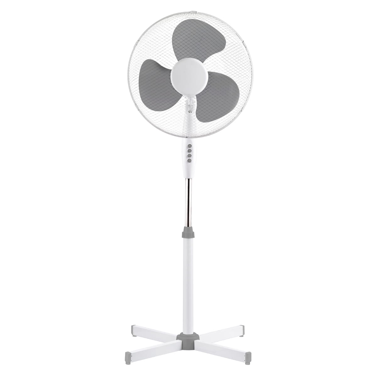 16-inch standing fan. SOLID CONSTRUCTION The wide base provides the fan with stability and comfort of use on a slow surface. The fan blades have been secured with a metal net thanks to which the fan is completely safe to use. TECHNICAL SPECIFICATIONS Power supply: 230V, 50Hz, 40W Engine: 12 mm Protective mesh 3 windmill blades Height: 120 cm Cross base: 60×60 cm Color: gray